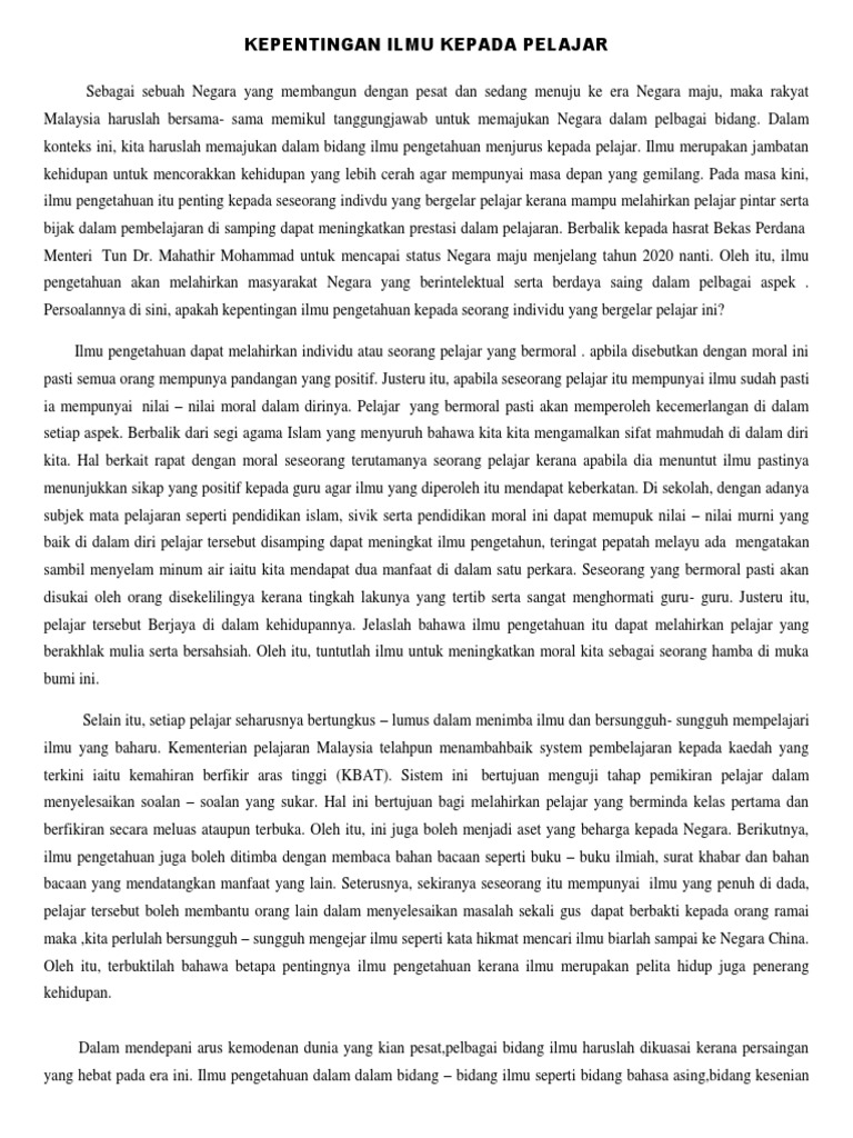 Contextual translation of karangan kepentingan menuntut ilmu from malay into arabic. Secara tuntasnya amalan membaca ini haruslah dijadikan budaya dalam kehidupan agar amalan ini terus diamalkan dari zaman ke zaman tanpa perlu lagi diadakan kempen kesedaran kepada masyarakat. Karangan BM Bahasa Melayu SPM.